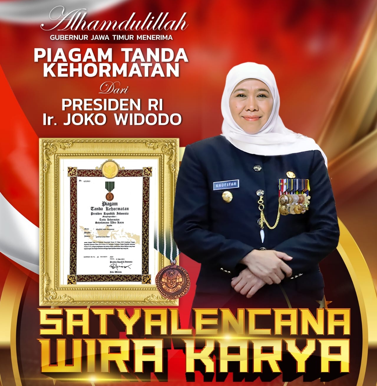 KANALSATU - Gubernur Jawa Timur Khofifah Indar Parawansa berhasil meraih penghargaan Tanda Kehormatan Satyalancana Wirakarya atas keberhasilan Pemerintah Provinsi Jawa Timur dalam Pembangunan Sumber Daya Manusia Pertanian.