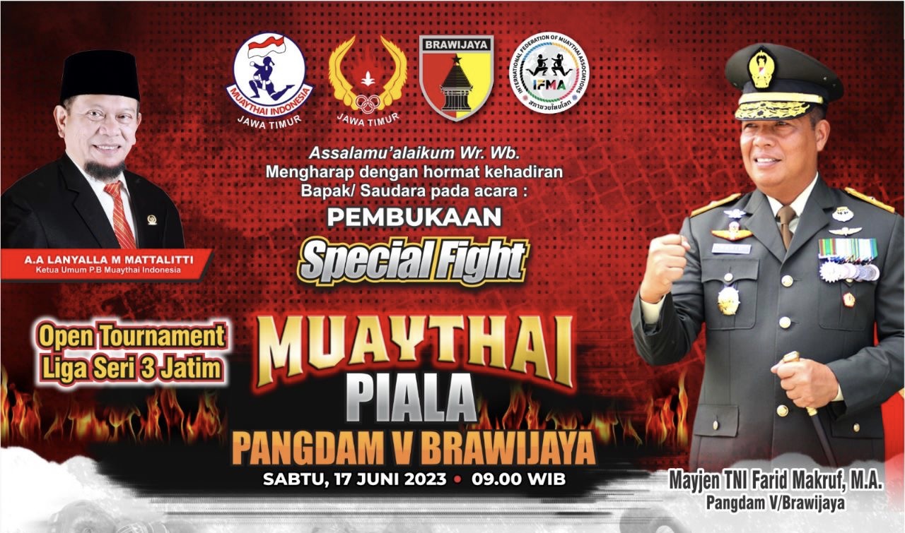 Kejuaraan Piala Pangdam V Brawijaya sendiri, akan dilakukan pada pukul 10.00 WIB dan akan dihadiri langsung oleh Ketua Umum PB MuayThay Indonesia, AA LaNyalla Mahmud Mattalitti, Pangdam V Brawijaya Farid Makruf, dan sejumlah ketua Pengprov MI dan Pengkot MI di Jatim.