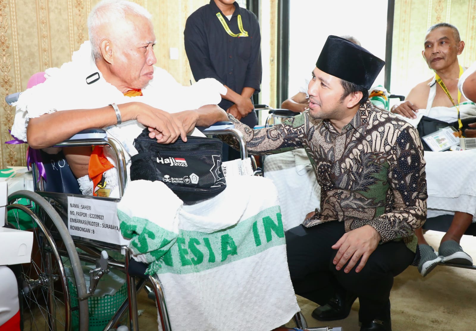 KANALSATU - Wakil Gubernur Jawa Timur Emil Elestianto Dardak meninjau kondisi jamaah haji embarkasi Surabaya kloter 58 asal Kab. Bondowoso di Asrama Haji, Rabu (14/6/2023).