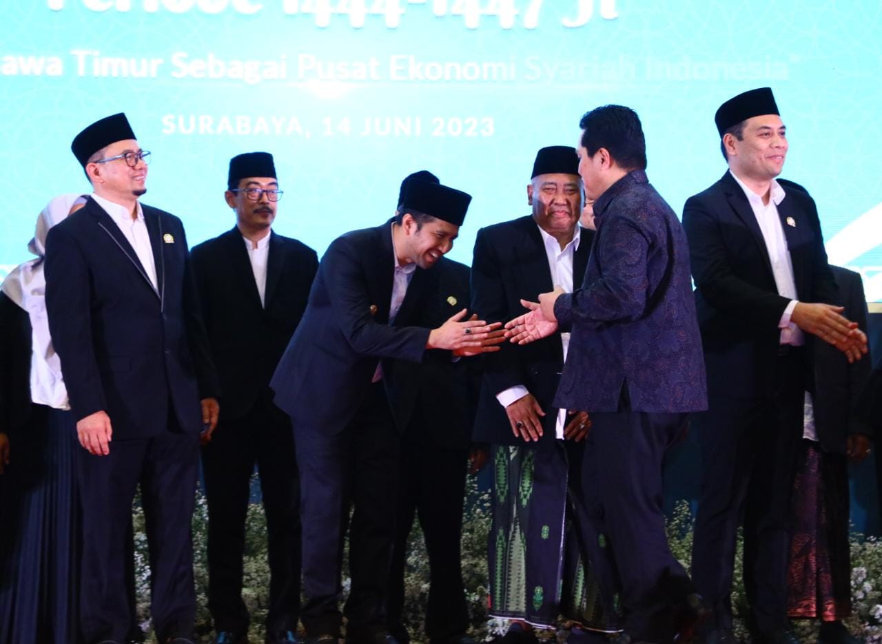 KANALSATU - Wakil Gubernur Jawa Timur Emil Elestianto Dardak resmi dilantik dan dikukuhkan sebagai Ketua Umum (Ketum) Pengurus Wilayah Masyarakat Ekonomi Syariah (MES) Jawa Timur periode 1444-1447 H. Pelantikan dan pengukuhan ini dilakukan oleh Ketum Pengurus Pusat (PP) MES Erick Thohir di Gedung Islamic Centre, Surabaya, Rabu (14/6/2023).