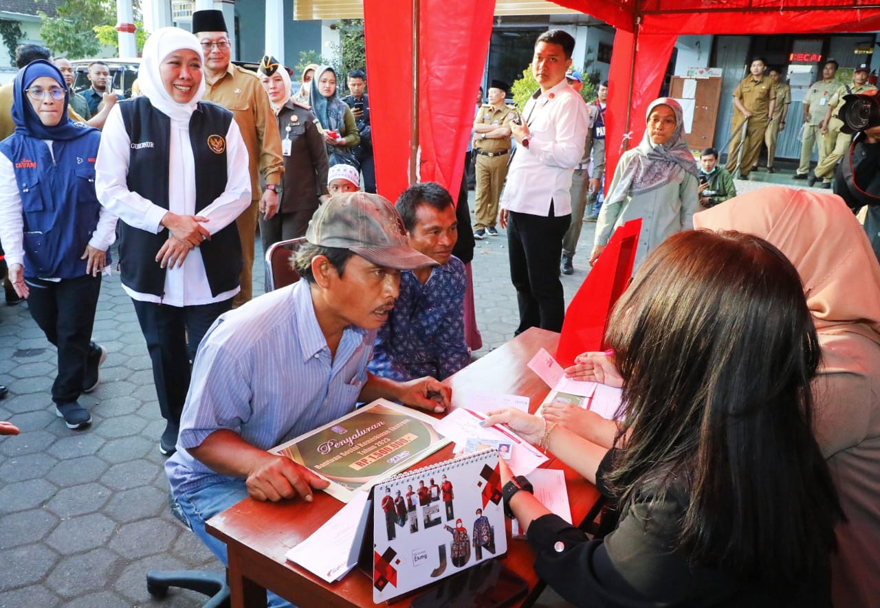KANALSATU - Gubernur Jawa Timur Khofifah Indar Parawansa menyalurkan Bantuan Sosial (Bansos) bagi Keluarga Penerima Manfaat kategori kemiskinan ekstrem dan zakat produktif bagi pelaku usaha ultra mikro di Kantor Kecamatan Gondanglegi, Kab. Malang, Selasa (27/6/2023).