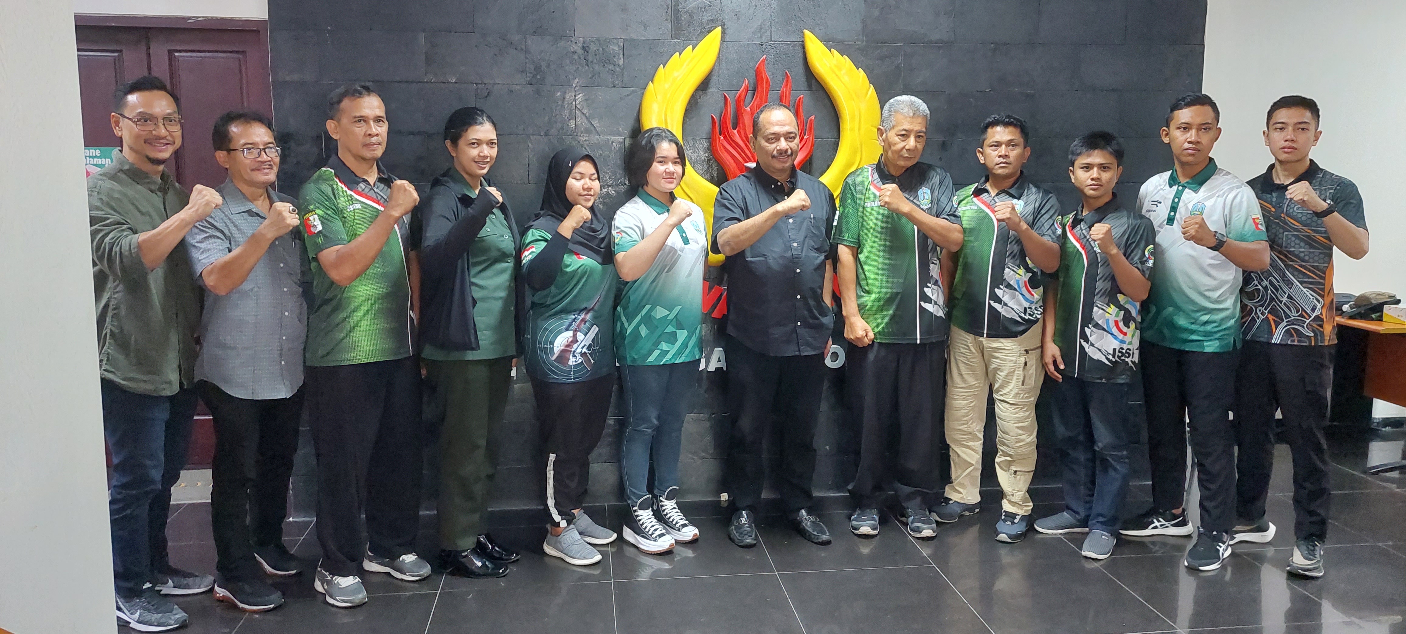 KANALSATU - Atlet menembak yang akan mengikuti Pra PON Piala Kapolri Cup, dilepas Ketua Umum KONI Jawa Timur (Jatim), M Nabil, di Gedung Suhartatik, Jl. Kertajaya Indah, Surabaya, Kamis (6/7/2023).