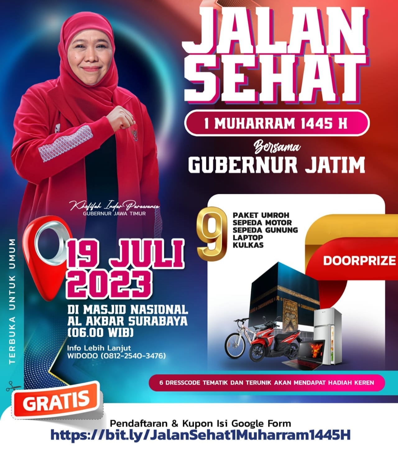 Pemprov Jatim secara khusus menggelar kegiatan Jalan sehat menyambut 1 Muharram 1445 H bersama Gubernur Jawa Timur Khofifah Indar Parawansa yang akan mengambil start dan finish di Masjid Nasional Al Akbar Surabaya (MAS), Rabu (19/7/2023).