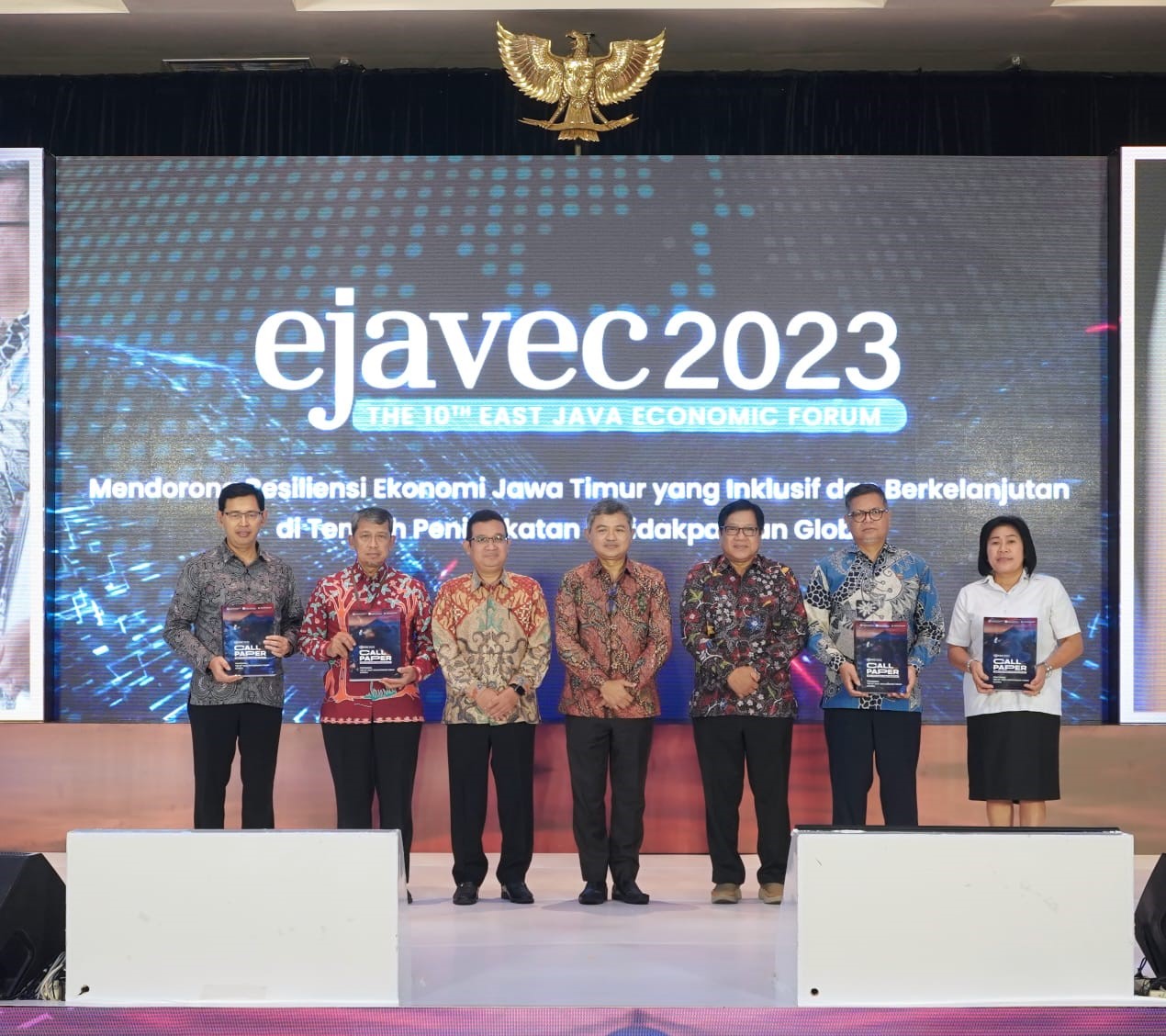 KANALSATU - Kantor Perwakilan Bank Indonesia Provinsi Jawa Timur bersama dengan Fakultas Ekonomi dan Bisnis Universitas Airlangga serta ISEI Cabang Surabaya Koordinator Jawa Timur kembali menggelar Conference & Winner Announcement kegiatan East Java Economic (EJAVEC). EJAVEC tahun 2023 yang merupakan penyelenggaraan yang ke-10 ini mengangkat tema “Mendorong Resiliensi Ekonomi Jawa Timur yang Inklusif dan Berkelanjutan di Tengah Peningkatan Ketidakpastian Global”.