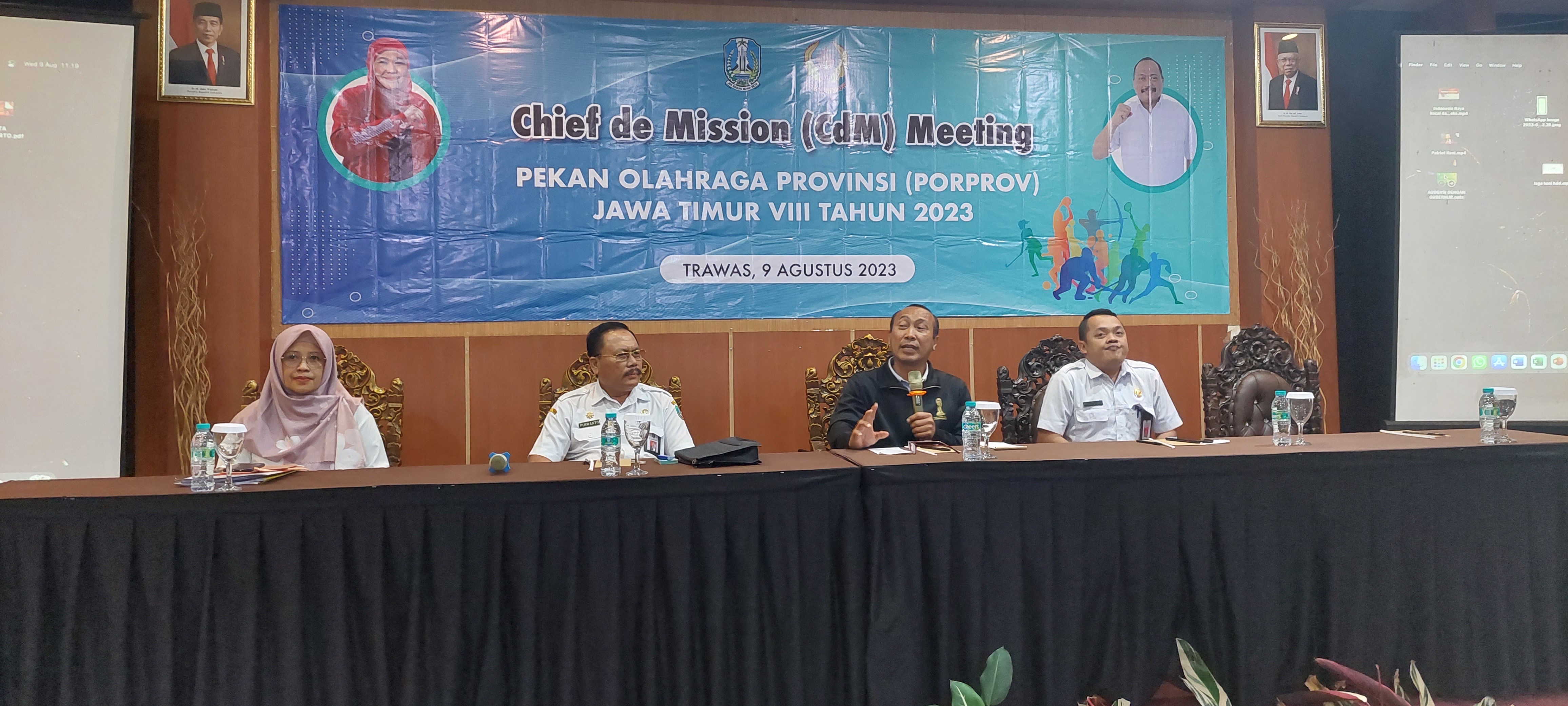 KANALSATU- Komite Olahraga Nasional Indonesia (KONI) Jawa Timur (Jatim), dan Panitia Besar Pekan Olahraga Provinsi VIII/2023 (PB Porprov) menggelar Chefs de Mission (CdM) Meeting (pertemuan ketua rombongan) di Hotel Arayanna, Trawas, Kabupaten Mojokerto, Rabu, 9 Agustus 2023.