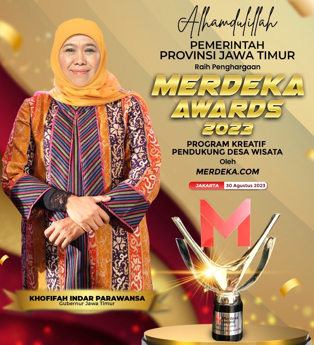KANALSATU - Pemerintah Provinsi Jawa Timur mendapatkan penghargaan kategori Program Desa Wisata pada ajang Merdeka Awards 2023 yang diselenggarakan merdeka.com. Penghargaan ini diberikan sebagai bentuk apresiasi pada Pemprov Jatim yang telah melakukan berbagai inovasi maupun terobosan dalam pengembangan program Desa Wisata dan menjadikannya terbaik se-Indonesia.