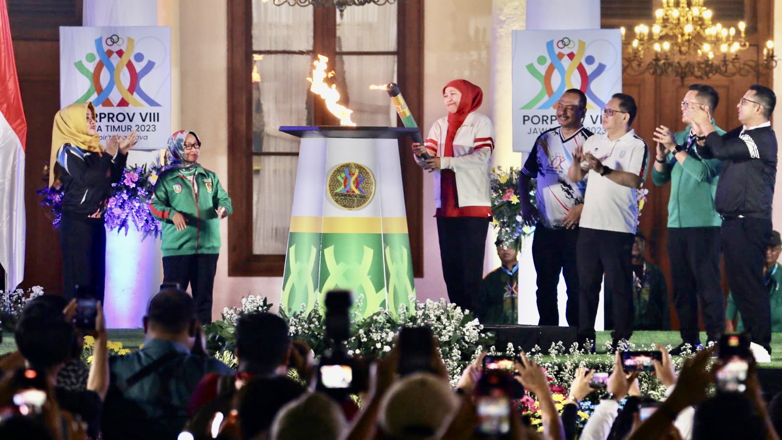 Pada Kamis malam tanggal 7 September 2023, api obor Porprov tiba di Gedung Negara Grahadi, diserahkan Ketua Umum KONI Jatim, M Nabil kepada Gubernur Khofifah Indarparawansa, dan langsung disulutkan di kaldron.