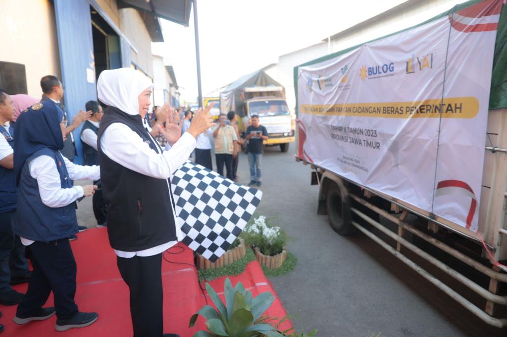 Launching ini ditandai dengan pemberangkatan delapan truck yang akan mendistribusikan bantuan beras oleh Gubernur Khofifah didampingi Pemimpin Wilayah Perum BULOG, beberapa Kepala OPD dan Direktur BUMD, di Gudang Bulog Banjarkemantren, Buduran, Sidoarjo, Rabu (13/9/2023).