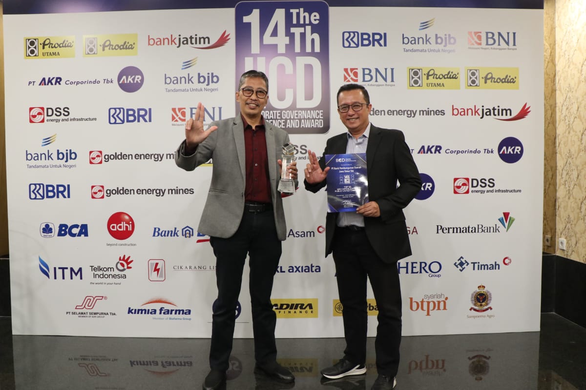 Penghargaan ini diterima Direktur Utama Bank Jatim Busrul Iman didampingi Corporate Secretary Bank Jatim Wioga Adhiarma Aji di Financial Hall, Graha CIMB Niaga, Jakarta, Senin (18/9/2023).