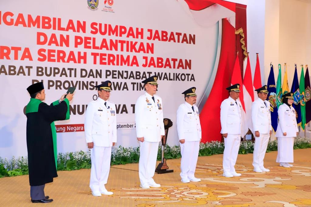 KANALSATU - Gubernur Jawa Timur Khofifah Indar Parawansa resmi melantik dan mengambil sumpah jabatan enam Penjabat (Pj) Bupati untuk kabupaten yang kepala daerahnya habis masa jabatannya hari ini, di Gedung Negara, Grahadi, Surabaya, Minggu (24/9/2023).