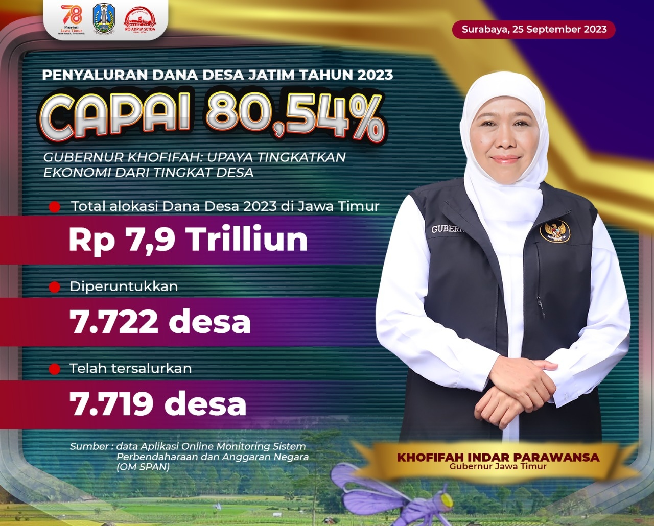 KANALSATU - Berdasarkan data Aplikasi Online Monitoring Sistem Perbendaharaan dan Anggaran Negara (OM SPAN) per 25 September 2023 penyaluran dana desa Provinsi Jawa Timur tahun 2023 telah mencapai sebesar Rp6,4 Trilliun atau 80,54 persen. Sementara total alokasi Dana Desa 2023 di Jawa Timur mencapai Rp7,9 Trilliun bagi 7.722 desa.
