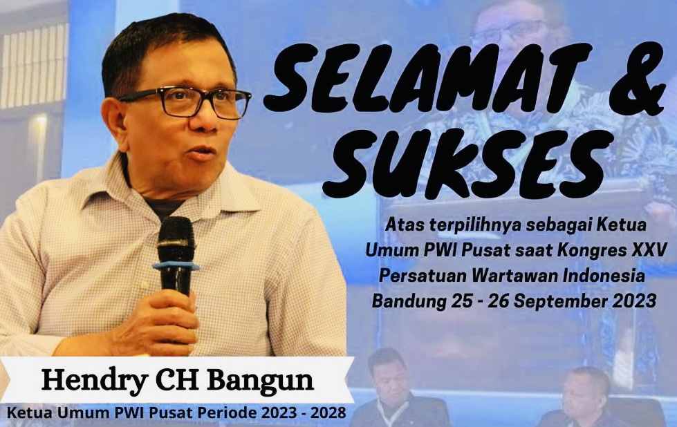 KANALSATU - Hendry CH Bangun akhirnya terpilih sebagai Ketua Umum Persatuan Wartawan Indonesia (PWI) Periode 2023-2028, menggantikan Atal Sembiring Depari, pada Konggres XXV PWI, di Bandung.