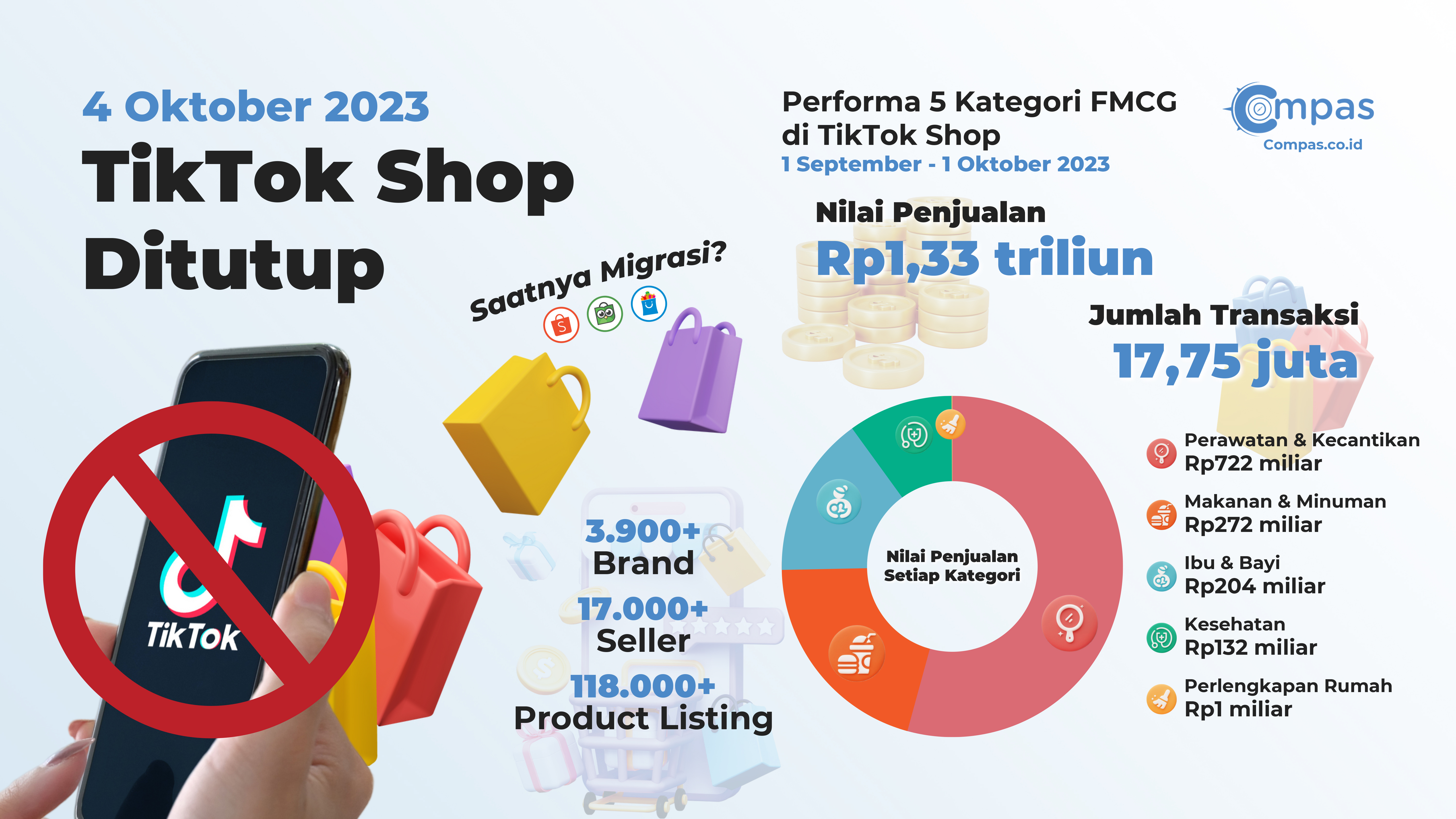 Di samping itu, Compas.co.id juga menelusuri bahwa pada periode 1 September - 1 Oktober 2023 terdapat 17.000+ seller, 3900+ brand FMCG dan 118.000+ product listing pada kategori perawatan kecantikan, makanan minuman, ibu bayi, kesehatan, serta perlengkapan rumah yang akan terdampak dari tutupnya TikTok Shop.