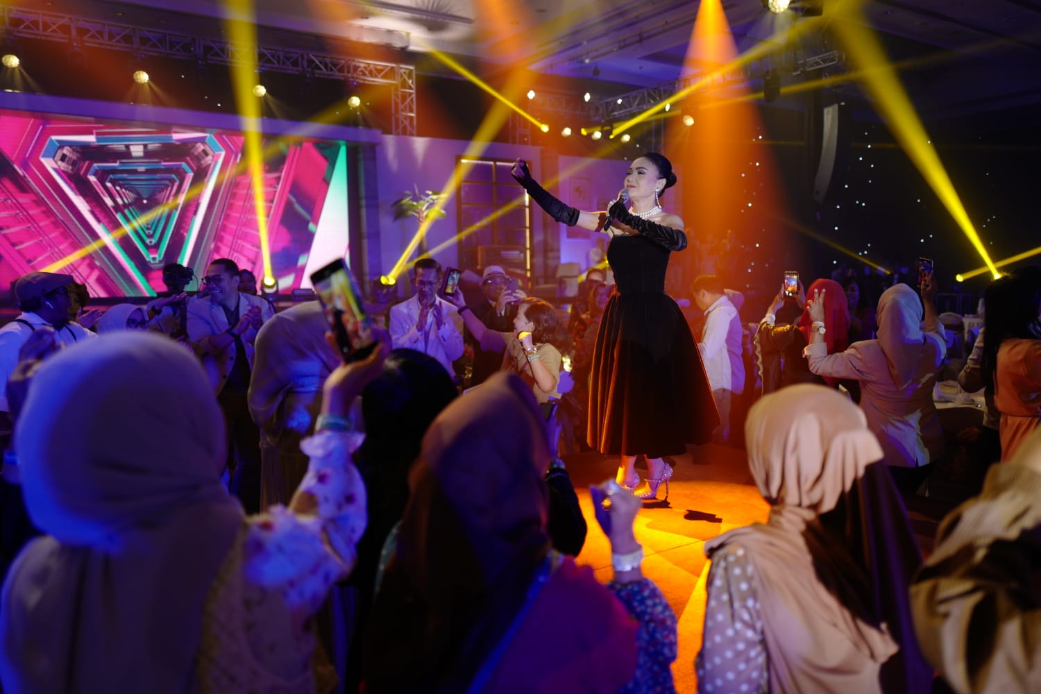 Kemudian, Yuni meninggalkan panggung utama lalu naik ke panggung kecil di tengah-tengah tamu. Seluruh tamu yang hadir diajak berjoget menikmati alunan musik dangdut itu.
