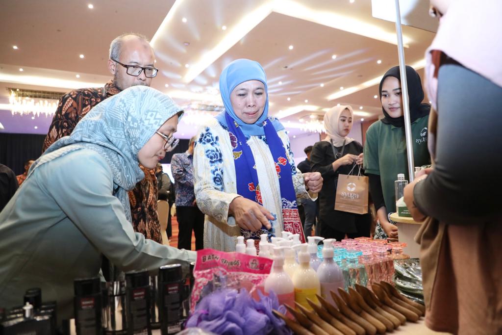 Usai acara, Gubernur Khofifah turut meninjau stand yang menjual berbagai produk halal. Mulai minuman herbal, kosmetik, kopi, bumbu dapur, makanan seperti biskuit, abon, keripik, kemudian multi vitamin, serta berbagai produk batik. (KS-5)