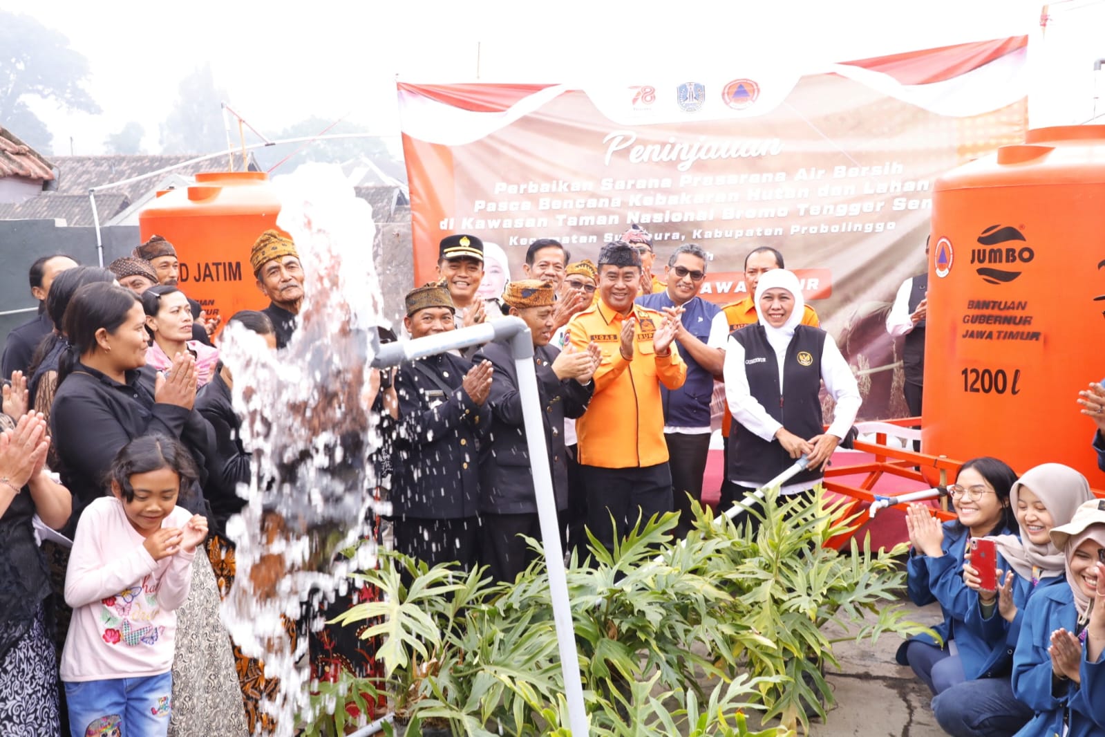 Pada kesempatan ini, Gubernur Khofifah menyampaikan terima kasih kepada Badan Penanggulangan Bencana Daerah (BPBD) Jatim, perangkat desa, tokoh adat setempat dan warga sekitar, serta sukarelawan yang dengan sungguh-sungguh bahu membahu melakukan perbaikan dan pemasangan pipa saluran air bersih bagi warga terdampak sehingga warga kembali menikmati air bersih.