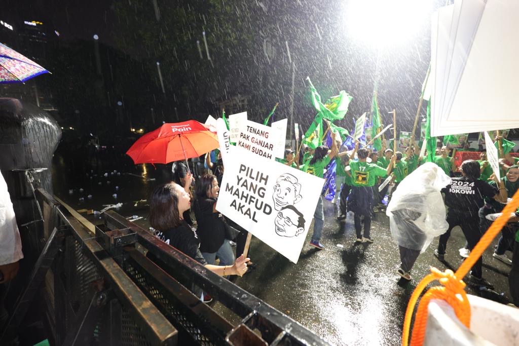 "Kita tetap bertahan untuk mendukung Ganjar Mahfud. Jangankan hujan seperti ini, hujan badai pun kami akan tetap bertahan demi mendukung Ganjar Mahfud," ucap Andika Prameswara, pendukung Ganjar asal Bekasi.