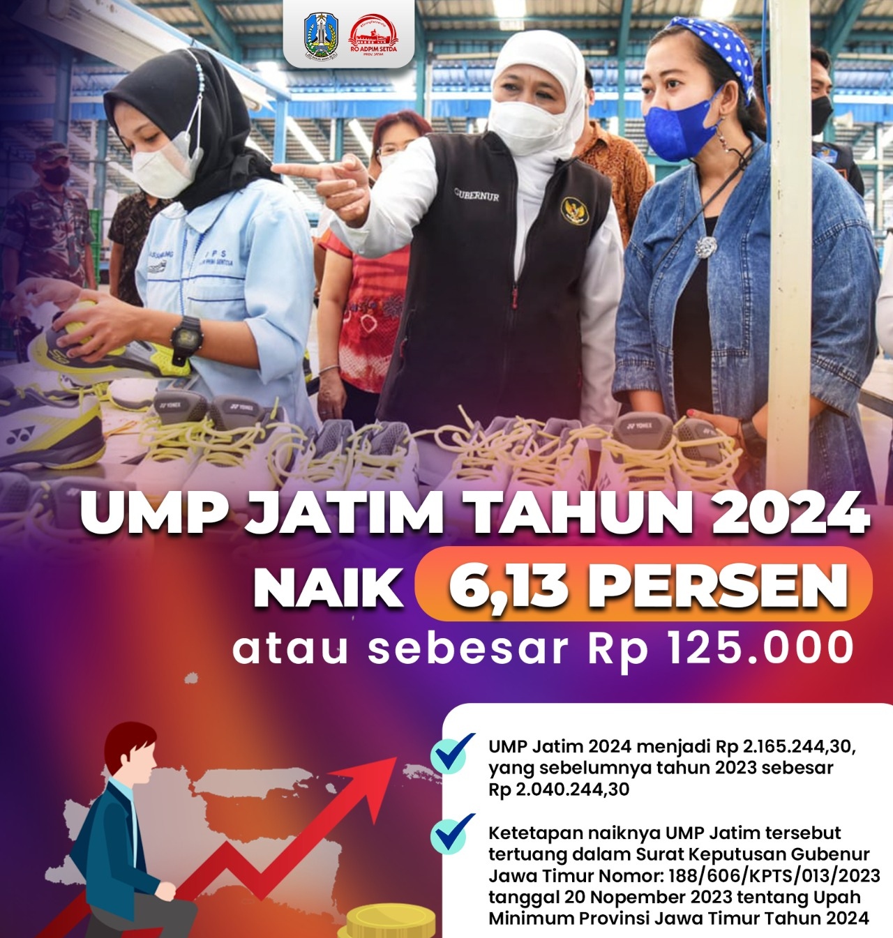 Ketetapan naiknya UMP Jatim tersebut tertuang dalam Surat Keputusan Gubenur Jawa Timur Nomor: 188/606/KPTS/013/2023 tanggal 20 Nopember 2023 tentang Upah Minimum Provinsi Jawa Timur Tahun 2024.
