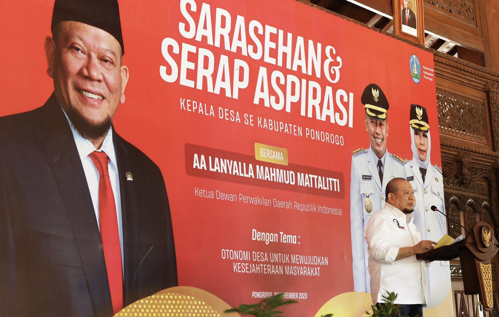 “Desa harus menjadi kekuatan ekonomi, bukan hanya untuk mencegah urbanisasi. Tetapi karena sumber daya alam dan sumber ketahanan pangan nasional, sejatinya berada di desa. Karena itu, sudah seharusnya pemerintah pusat mengucurkan dana desa yang diperbesar dari tahun ke tahun,” kata LaNyalla di hadapan seluruh kepala desa se Kabupaten Ponorogo.