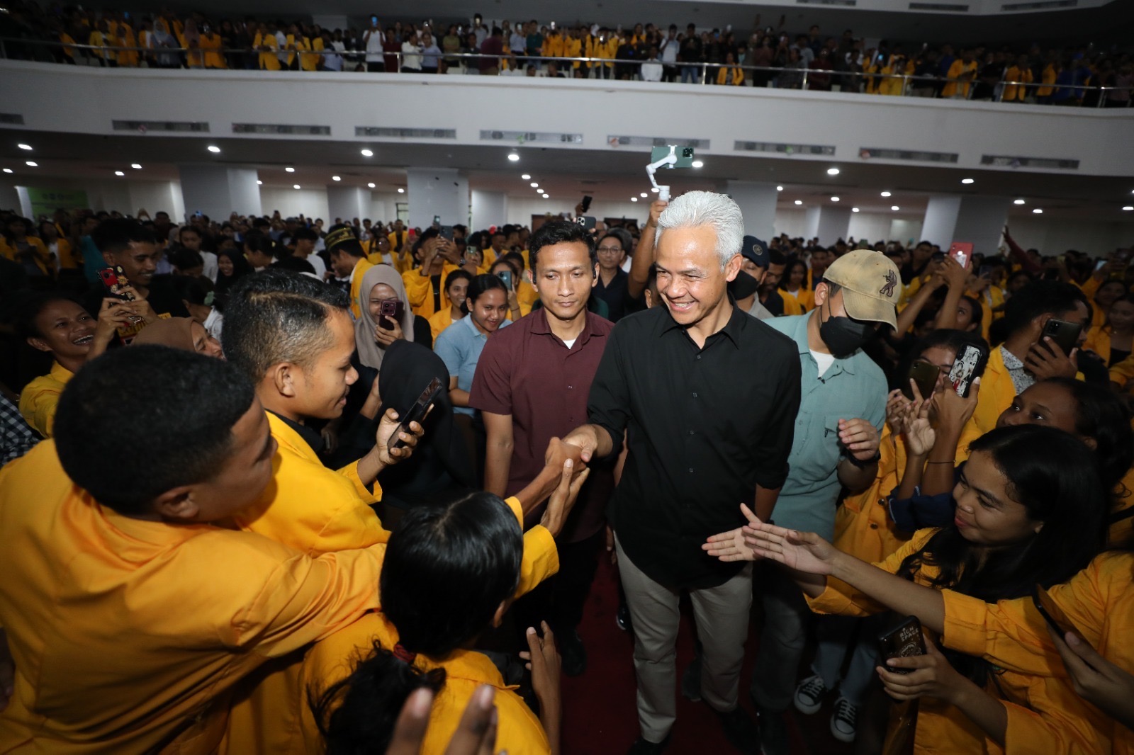 Tiba di lokasi, mahasiswa menyambut Capres 2024 nomor urut 3 itu dengan riuh tepuk tangan. Bahkan, mereka berebut salaman dan meminta berfoto selfi.