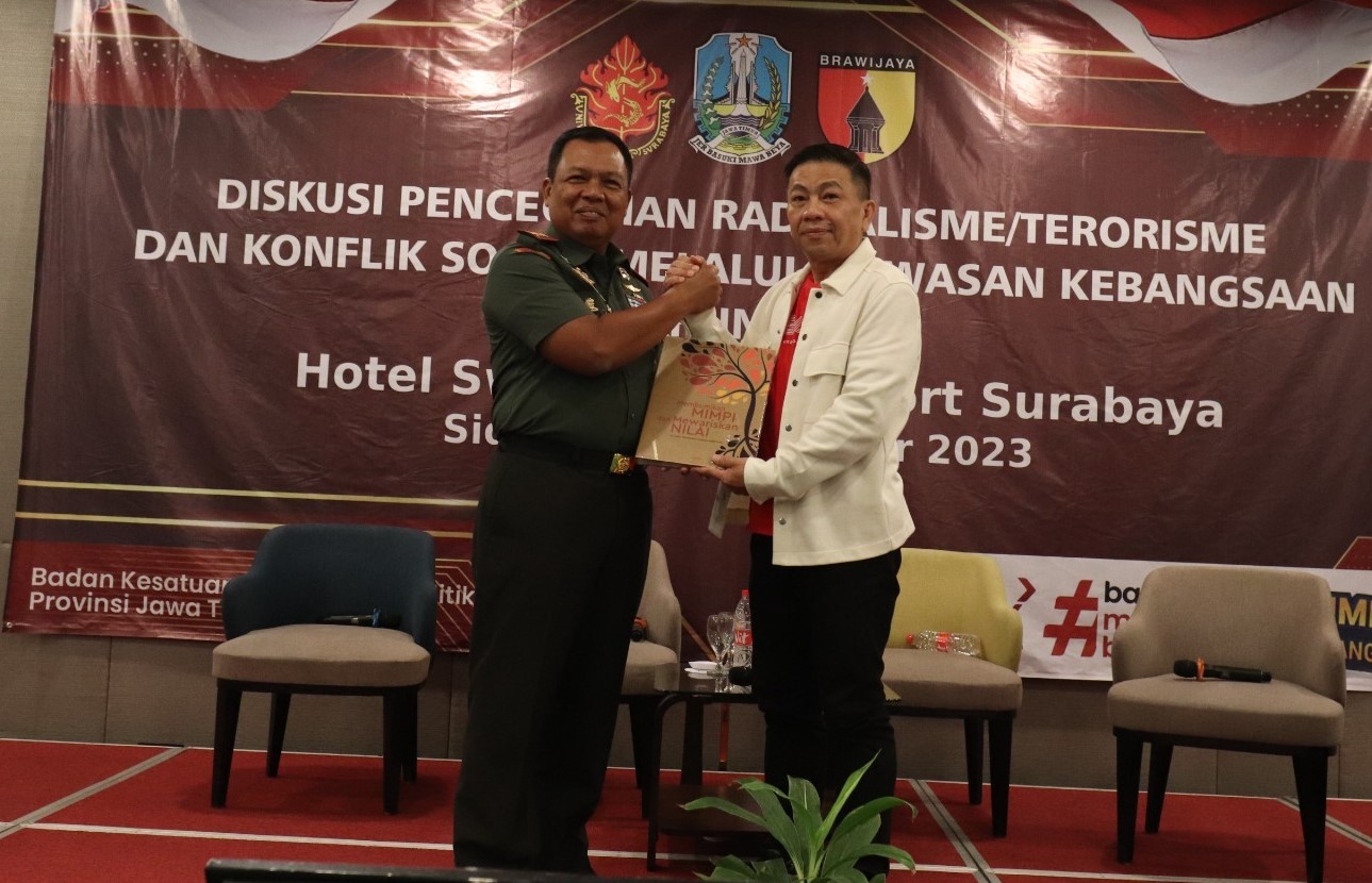 KANALSATU – Universitas Surabaya (Ubaya) menggelar diskusi dengan tema “Pencegahan Radikalisme/Terorisme dan Konflik Sosial Melalui Wawasan Kebangsaan Tahun 2023”. Pelaksanaan acara ini bekerja sama dengan Badan Kesatuan Bangsa dan Politik Provinsi Jawa Timur (Bakesbangpol Jatim) serta Komando Daerah Militer V Brawijaya (Kodam V/Brawijaya), Kamis (7/12/2023) di Sidoarjo.