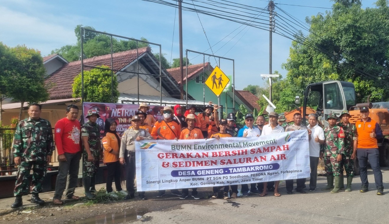KANALSATU - Unit Usaha PT Sinergi Gula Nusantara (SGN) Pabrik Gula Soedhono bersama masyarakat Desa Tambakromo dan Desa Geneng, Ngawi melaksanakan kegiatan pembersihan sampah dan sedimen saluran air tersier lingkungan warga, Sabtu (9/12/2023).