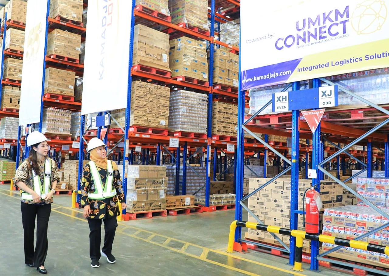 KANALSATU - Gubernur Jawa Timur Khofifah Indar Parawansa meresmikan Portal Logistik Usaha Mikro Kecil Menengah Jawa Timur (POROS UMI Jatim) di Distribution Center Kamadjaja Logistics (KLOG Park), Surabaya, Senin (11/12/2023).