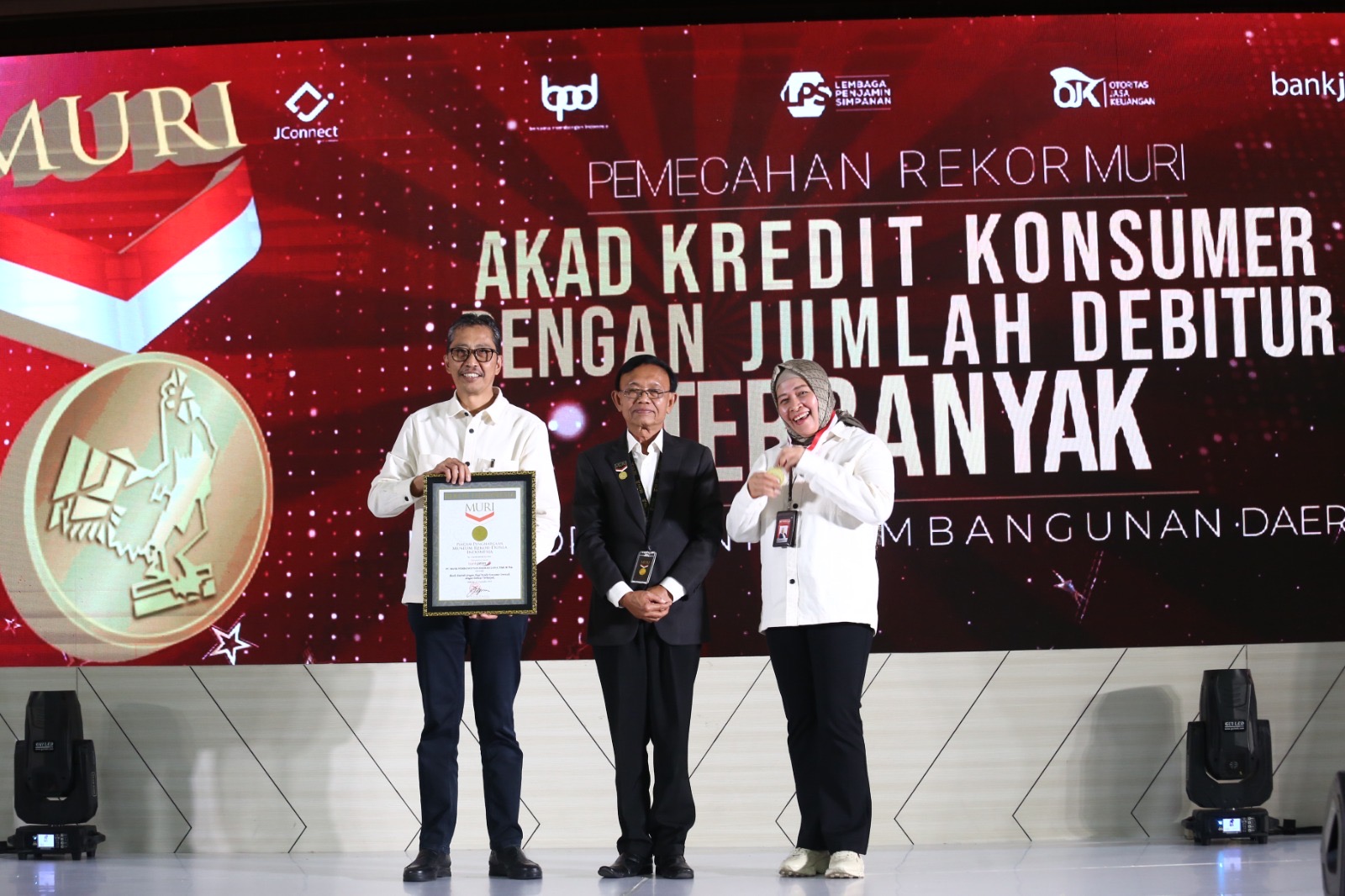 KANALSATU - PT Bank Pembangunan Daerah Jawa Timur Tbk (Bank Jatim) memecahkan rekor MURI setelah 2.312 debiturnya berhasil melaksanakan tanda tangan akad kredit secara serempak di seluruh kantor cabang Bank Jatim. Selain di Jawa Timur dilakukan Pula penandatanganan akad di Cabang Jakarta dan Cabang Batam dengan koordinasi terpusatkan di Kantor Pusat.