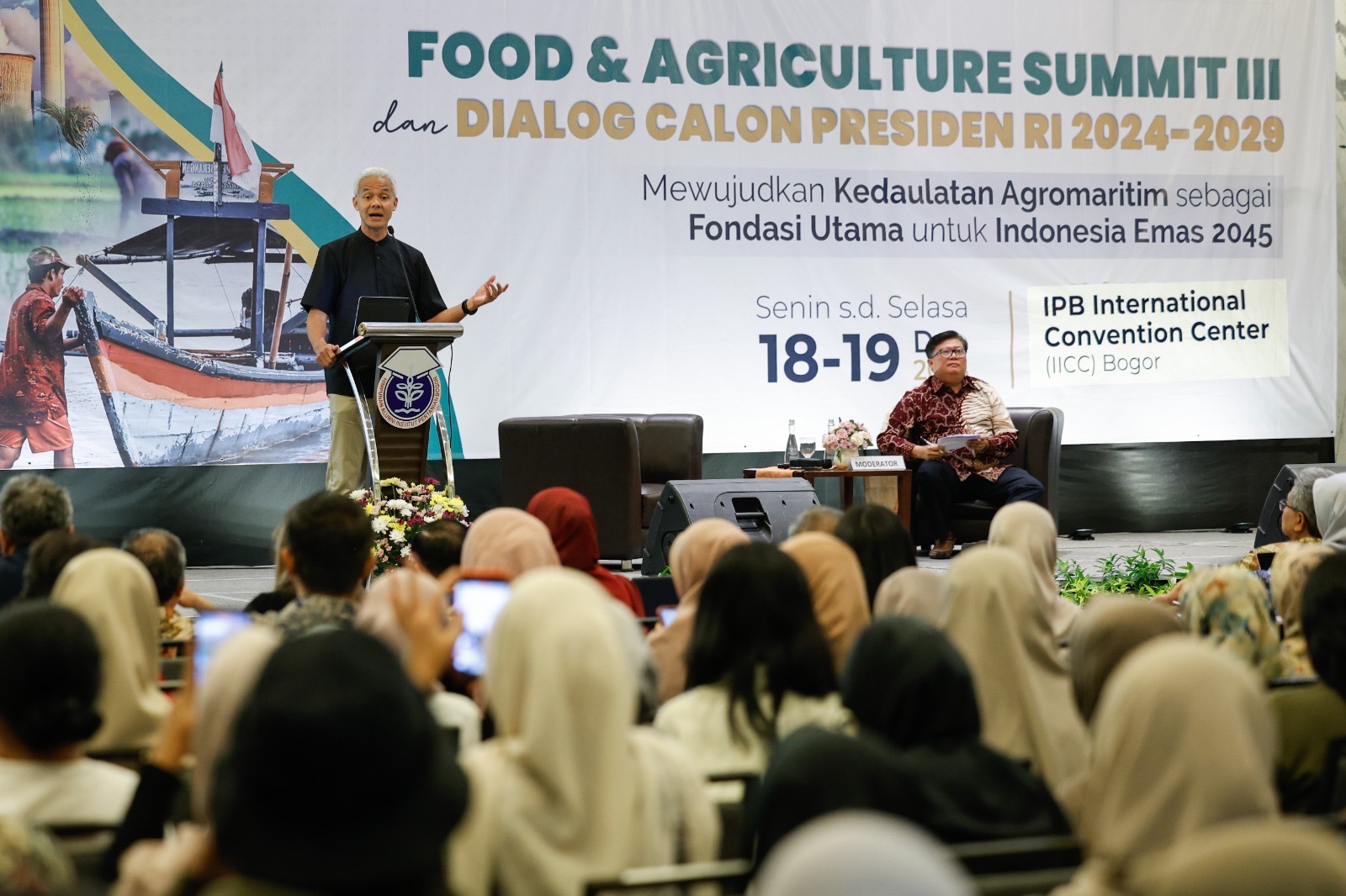 Hal itu, disampaikan Ganjar di hadapan para akademisi Institut Pertanian Bogor (IPB) dalam acara Food & Agriculture Summit III di IPB International Convention Center Bogor, Selasa (19/12/2023). Hadir dalam acara itu, Rektor dan Wakil Rektor IPB, para guru besar, dosen, alumni serta civitas akademika IPB lainnya.
