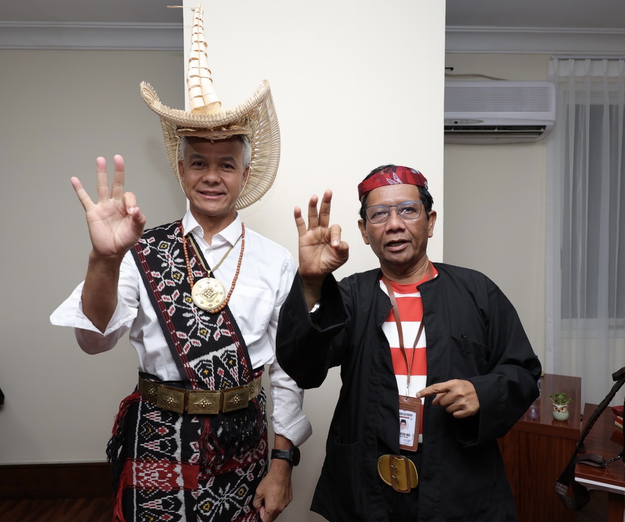 KANALSATU - Pasangan Capres-Cawapres 2024 nomor urut 3 Ganjar Pranowo dan Mahfud MD mengenakan baju adat nusantara saat hadiri debat kedua Komisi Pemilihan Umum (KPU), Jumat (22/12/2023). Tiba di Balai Sidang JCC Senayan, Jakarta, Ganjar tampak gagah mengenakan baju adat Rote (Nusa Tenggara Timur) dan Mahfud MD mengenakan pakaian khas Madura.