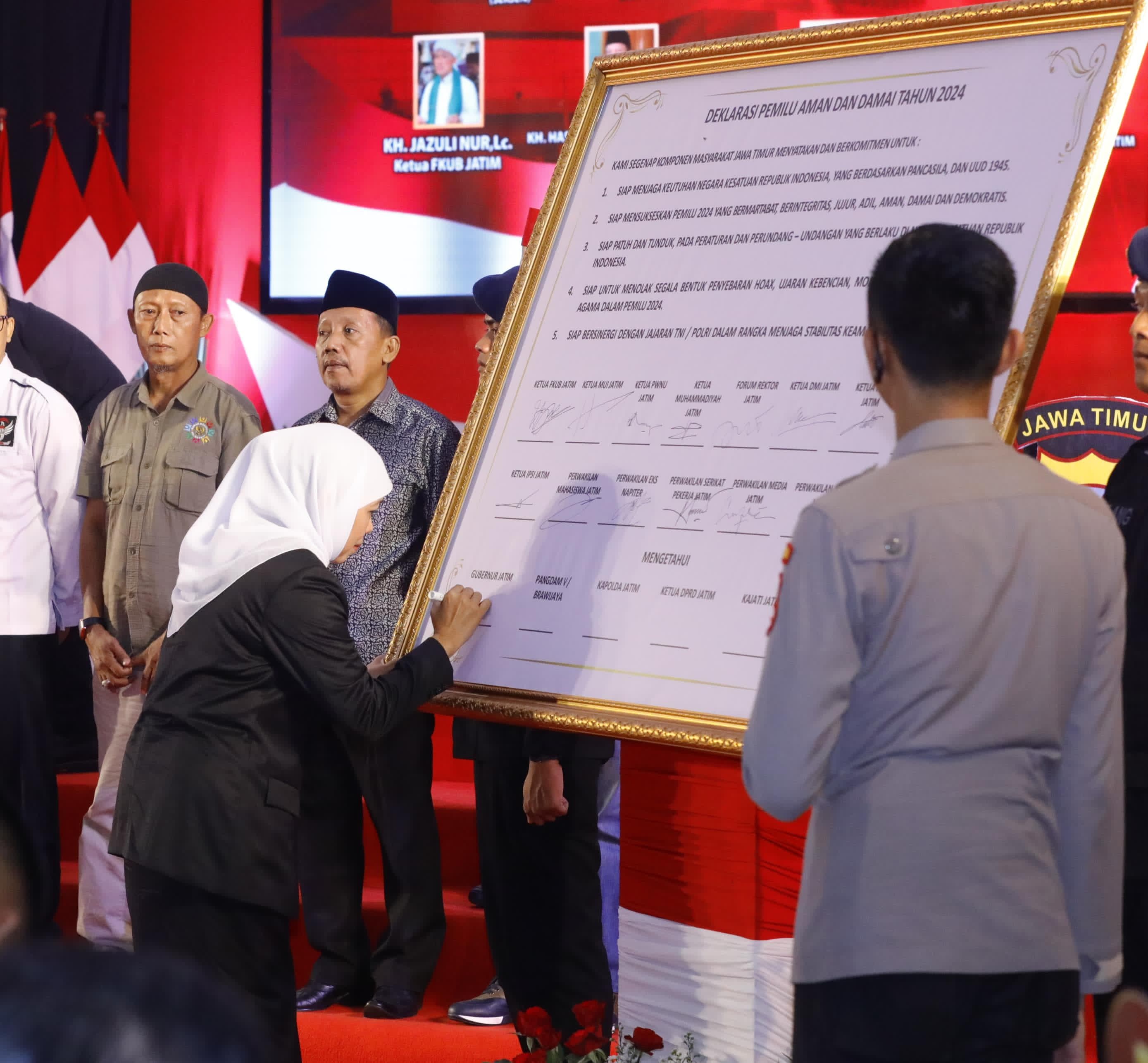 Kegiatan ini diawali dengan Pembacaan Deklarasi Pemilu Damai oleh Wakil Ketua MUI Jatim Prof. Halim Subahar. Dilanjutkan dengan penandatanganan deklarasi yang dilakukan oleh berbagai elemen masyarakat Jatim dilanjutkan Gubernur Khofifah, Kapolda Jatim Irjen Pol Imam Sugianto, Pangdam V/Brawijaya Mayjen TNI Rafael Granada Baay, Kajati Jatim yang diwakilkan ASPIDMIL Kejati Jatim, Kalanti diwakilkan Hakim Tinggi, dan disaksikan langsung oleh Kapolri Jenderal Listyo Sigit Prabowo.