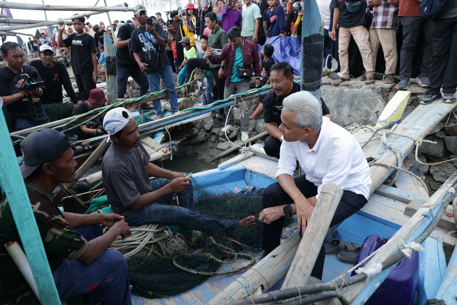 Setibanya di lokasi, Ganjar langsung menghampiri nelayan yang sedang memperbaiki jala di atas kapalnya dan mendengar keluhan mereka. Setelah itu, Ganjar naik ke atas panggung dan menyapa ribuan nelayan yang sudah menunggunya.