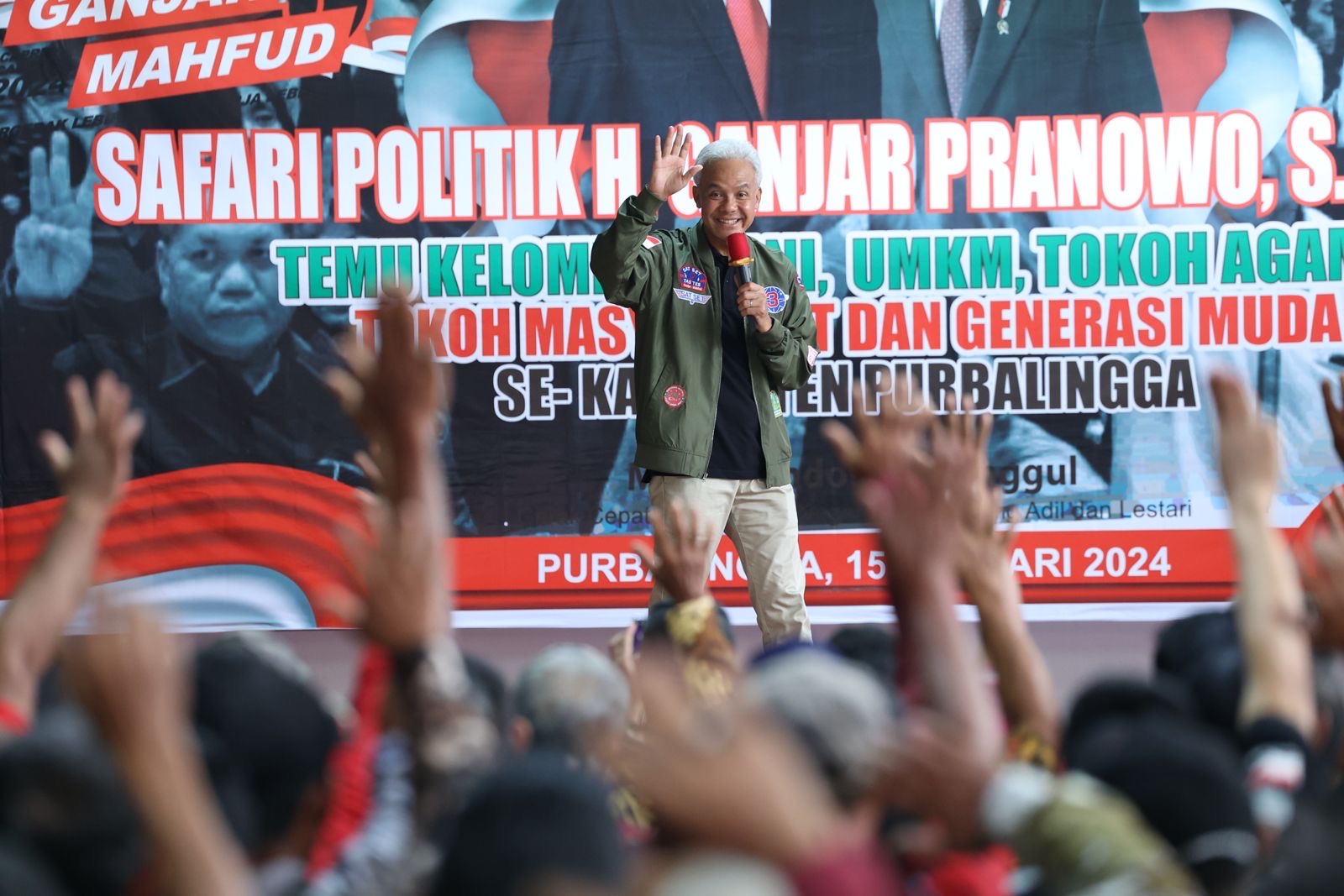 KANALSATU - Ganjar Pranowo mendapat sambutan luar biasa dari warga saat bersilaturahmi ke Purbalingga, Jawa Tengah, Senin (15/1/2024). Warga menganggap calon presiden nomor urut 03 itu "wonge dewek" atau berarti keluarga sendiri.