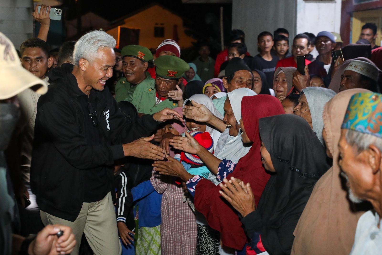Luar biasanya, kedatangan Capres nomor urut 3 itu disambut penuh meriah warga setempat. Ribuan warga langsung merangsek dan meminta salaman dengan politikus berambut putih itu, saat turun dari mobilnya.