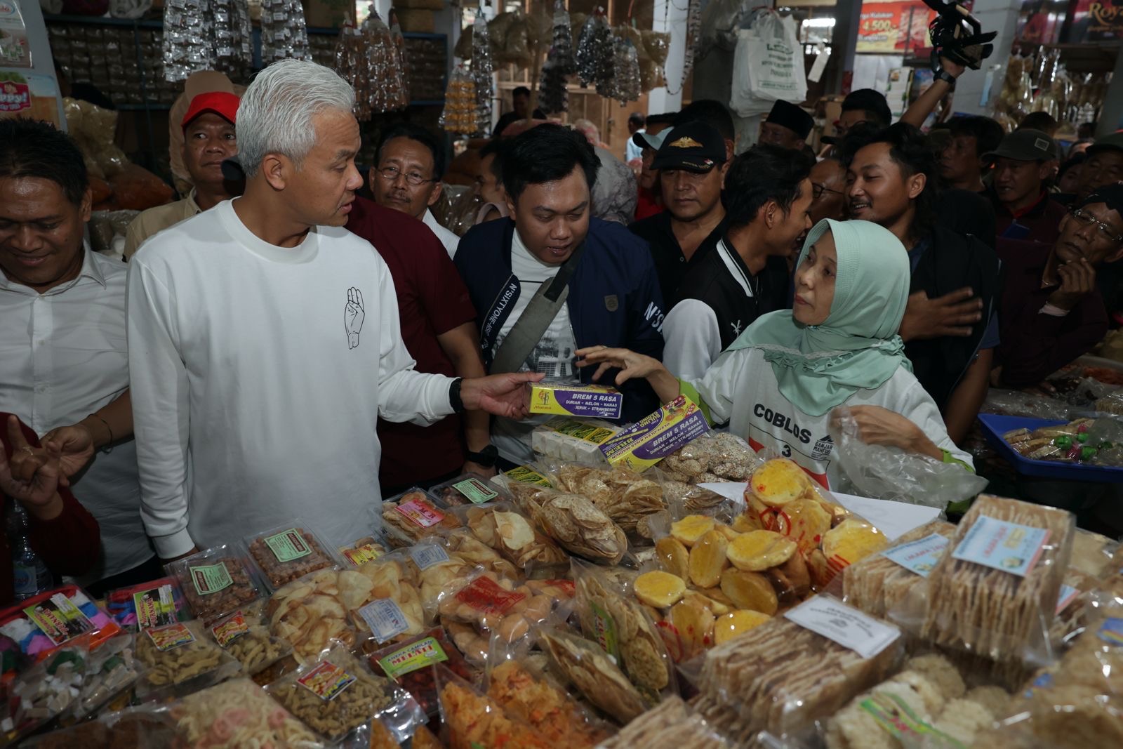 Capres berambut putih itu berkeliling ke kios-kois pedagang. Ia memborong sejumlah komoditas, sekaligus mengecek harga-harga dan menyerap aspirasi pedagang.