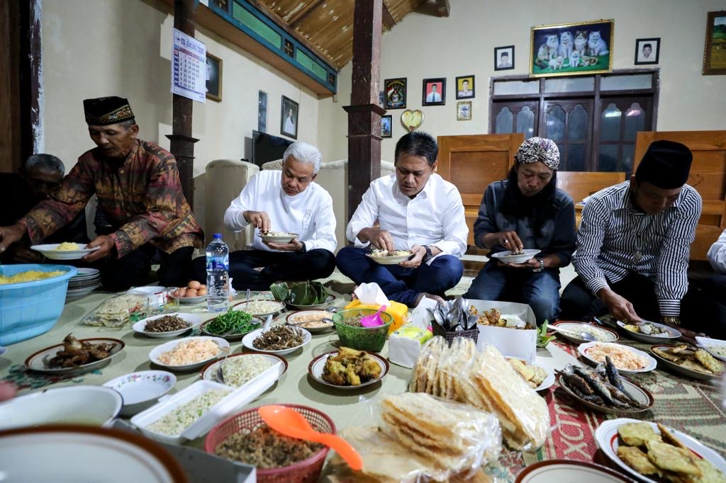 Mereka langsung masuk dan duduk lesehan di rumah Sardi. Di depan mereka, sudah tertata aneka makanan yang disajikan. Begitu Ganjar keluar kamar, mereka langsung menyambut dengan senyuman.