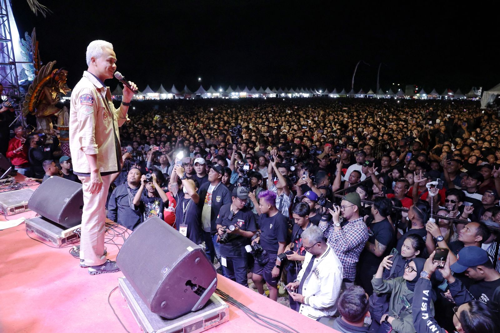 Riuh tepuk tangan mengiringi kehadiran Ganjar di atas panggung. Orang-orang tampak semringah dan antusias. Begitu pula dengan Ganjar, terlihat melambaikan tangan dan melempar senyum. Capres berambut putih itu kemudian berorasi untuk membakar semangat mereka.
