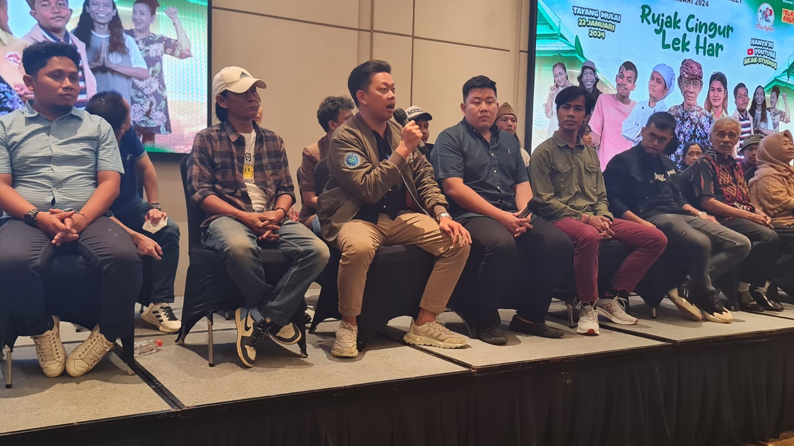 Produser RCLH Bayu Skak (pegang mic) bersama cast RCLH, Cak Silo sebagai pemeran Lek Har (Kiri) saat meet and greet di Ballroom Hotel Deka Surabaya Barat, Jawa Timur, Minggu (21/1/2024).