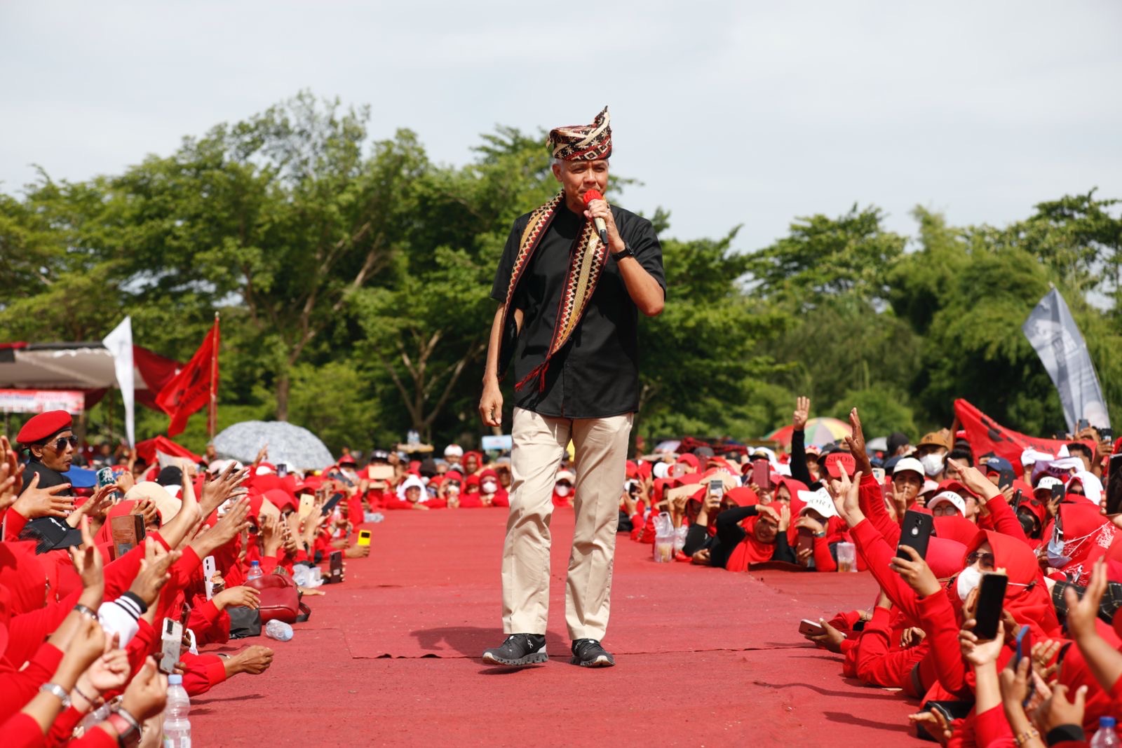 Ribuan massa, pendukung paslon Ganjar-Mahfud rela berpanas-panasan di bawah terik matahari untuk menyambut kedatangan Ganjar. Mereka tampak antusias, berteriak memanggil nama Ganjar, serta berebut salaman dan berswafoto.
