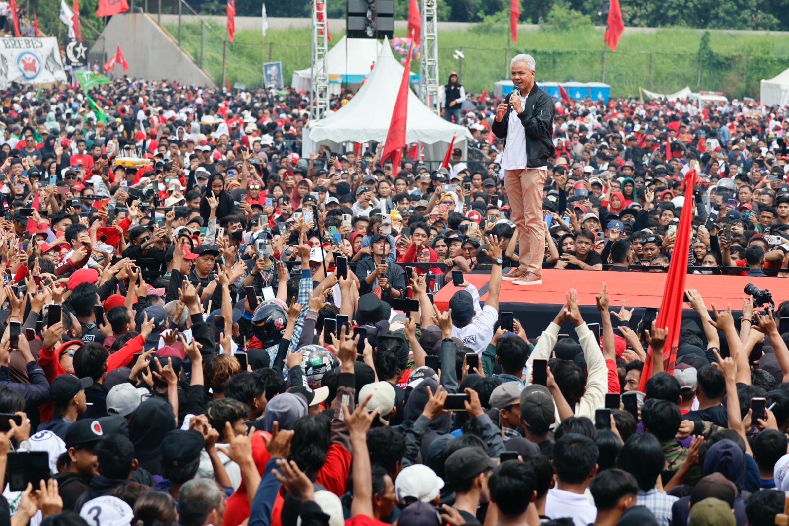 KANALSATU - Capres 2024 nomor urut 3, Ganjar Pranowo membakar semangat puluhan ribu pendukung dan simpatisannya yang hadir di acara Hajatan Rakyat di Stadion Bima Cirebon, Sabtu (27/1/2024). Ganjar menegaskan, para pendukungnya tidak boleh takut jika ada intimidasi dan harus berani melawan dengan cara yang benar sesuai konstitusi.