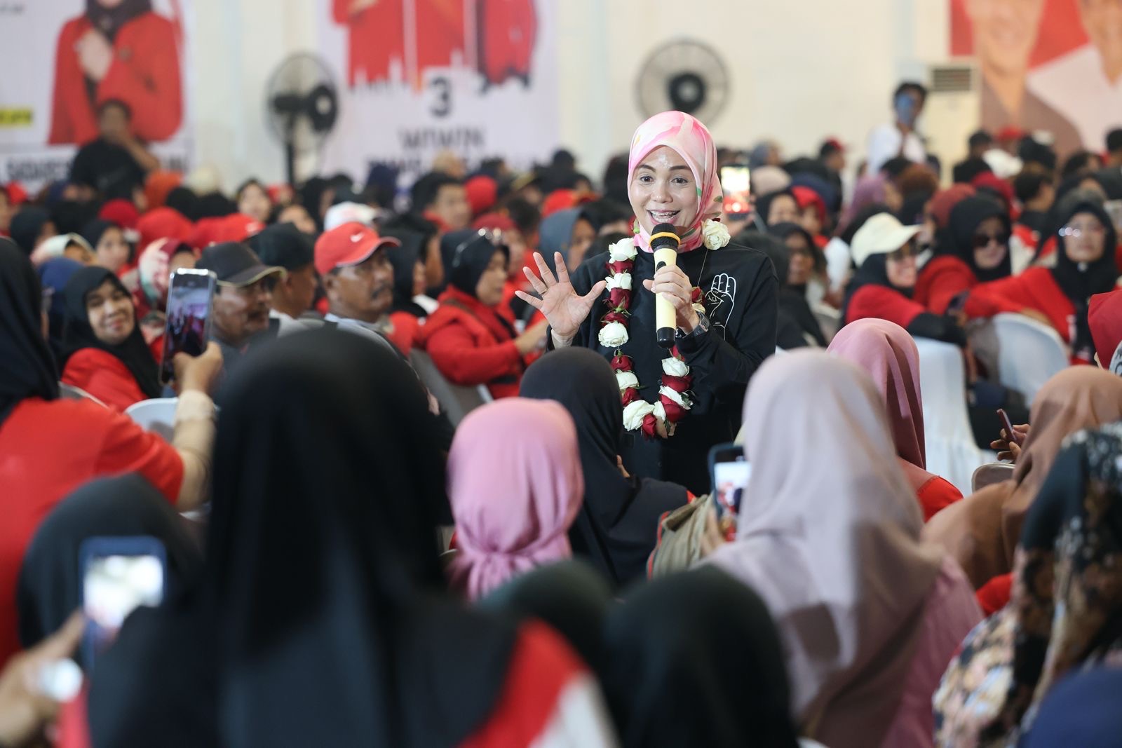 "Siap bergerak ya, datang ke TPS, itu yang pertama. Kemudian mengajak teman mengajak saudara, mengajak masyarakat untuk datang ke TPS, pilih yang mana, Bu? Nomor tiga. Jangan lupa yang lainnya dikasih tahu setelah itu," ucapnya.