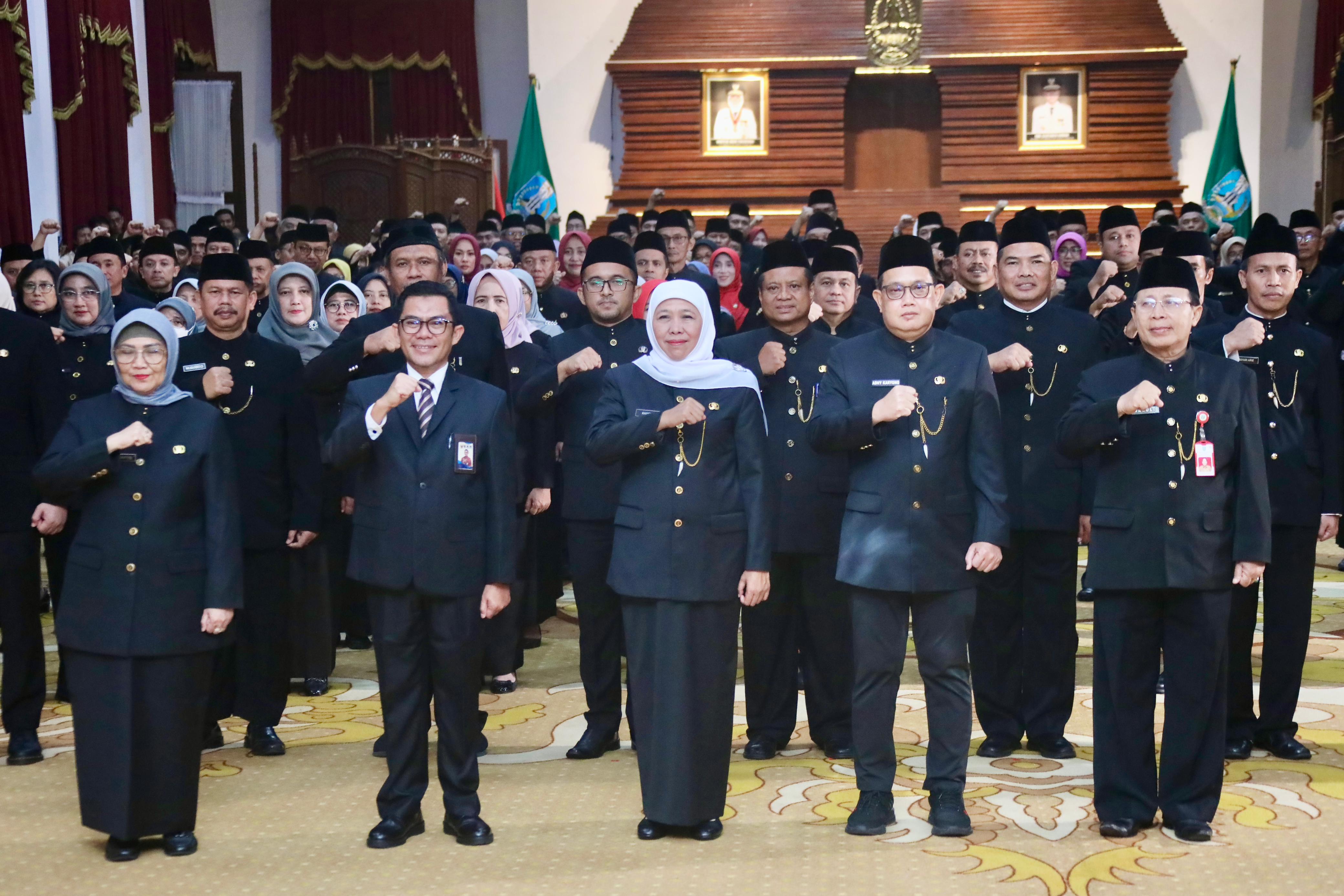 KANALSATU - Gubernur Jawa Timur Khofifah Indar Parawansa melantik 160 Pejabat Administrator Eselon III di lingkungan Pemerintah Provinsi Jawa Timur di Gedung Negara Grahadi Surabaya, Senin (29/1/2024) malam.
