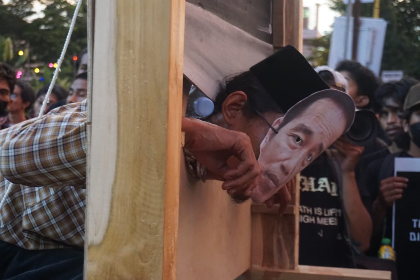 "Kami membawa replika guillotine dalam aksi hari ini yakni sebagai simbolisasi hukum pancung bagi rezim yang melanggengkan nepotisme, keserakahan, dan patriarki," ucap Sana Ulaili, Humas Jagad.