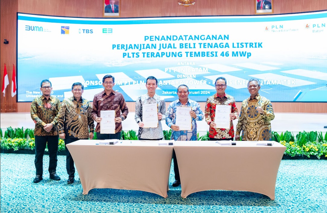 Penandatanganan Perjanjian Jual Beli Tenaga Listrik PLTS Terapung Tembesi 46 MWp antara PLN Nusantara yang diwakili Direktur Utama PLN NP Ruly Firmansyah (dua dari kanan), Direktur PT TBS Mufti (tiga dari kiri), Direktur Utama PT TBS Dicky Yordan (tengah) dengan Direktur Utama PLN Batam Irwansyah (tiga dari kanan).