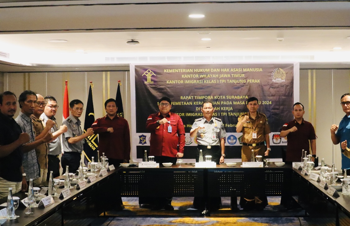 Rapat TIMPORA yang berlangsung Senin (12/2/2024) itu, bertujuan untuk memetakan potensi kerawanan yang berkaitan dengan keberadaan orang asing selama masa Pemilu 2024 di wilayah kerja Kantor Imigrasi Kelas I TPI Tanjung Perak.