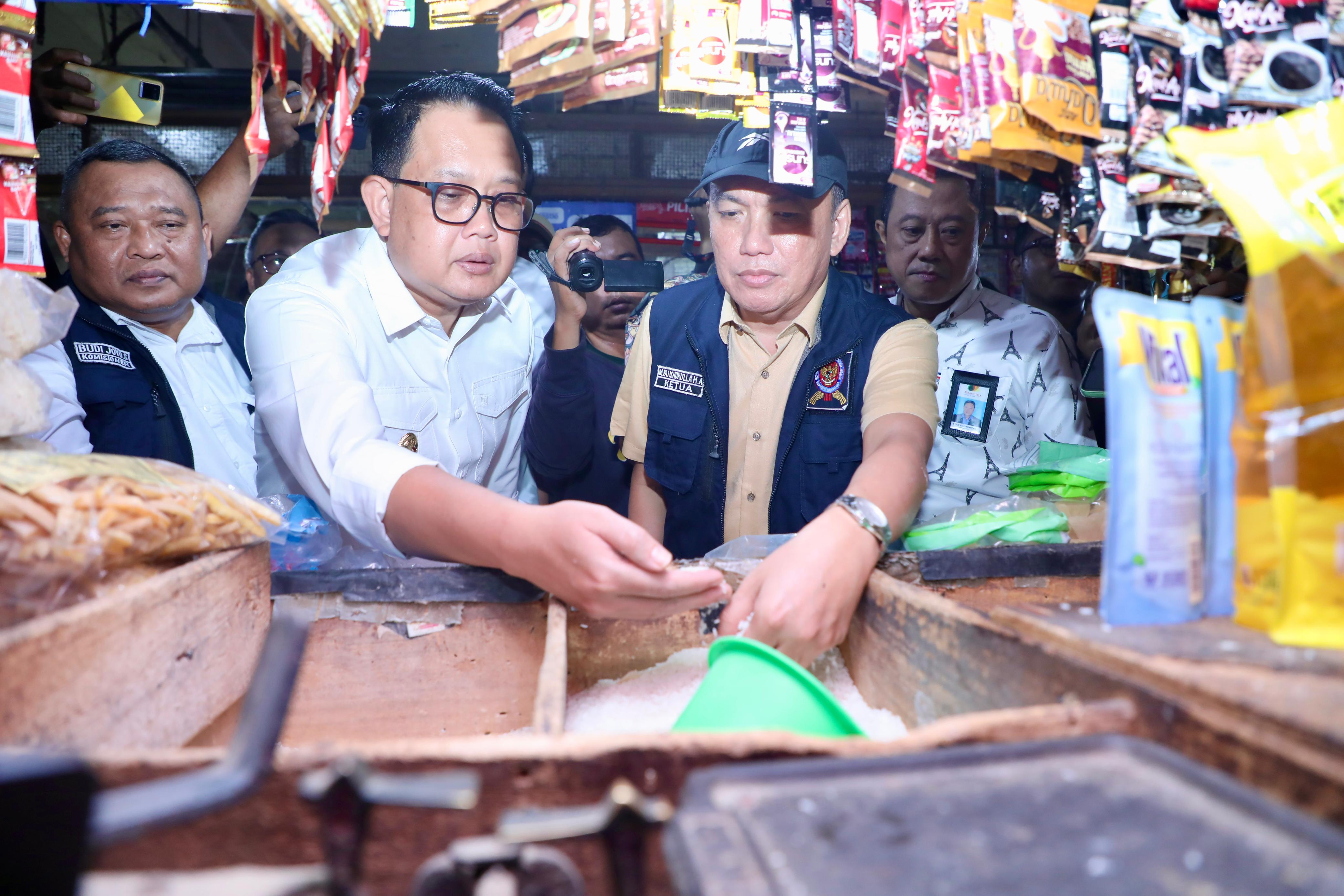 Didampingi Ketua Komisi Pengawas Persaingan Usaha (KPPU) RI Fanshurullah Asa saat meninjau Pasar Tambahrejo Surabaya, Pj. Gubernur Adhy langsung berdialog dengan satu per satu pedagang dan menanyakan update stok harga pangan yang di jual.