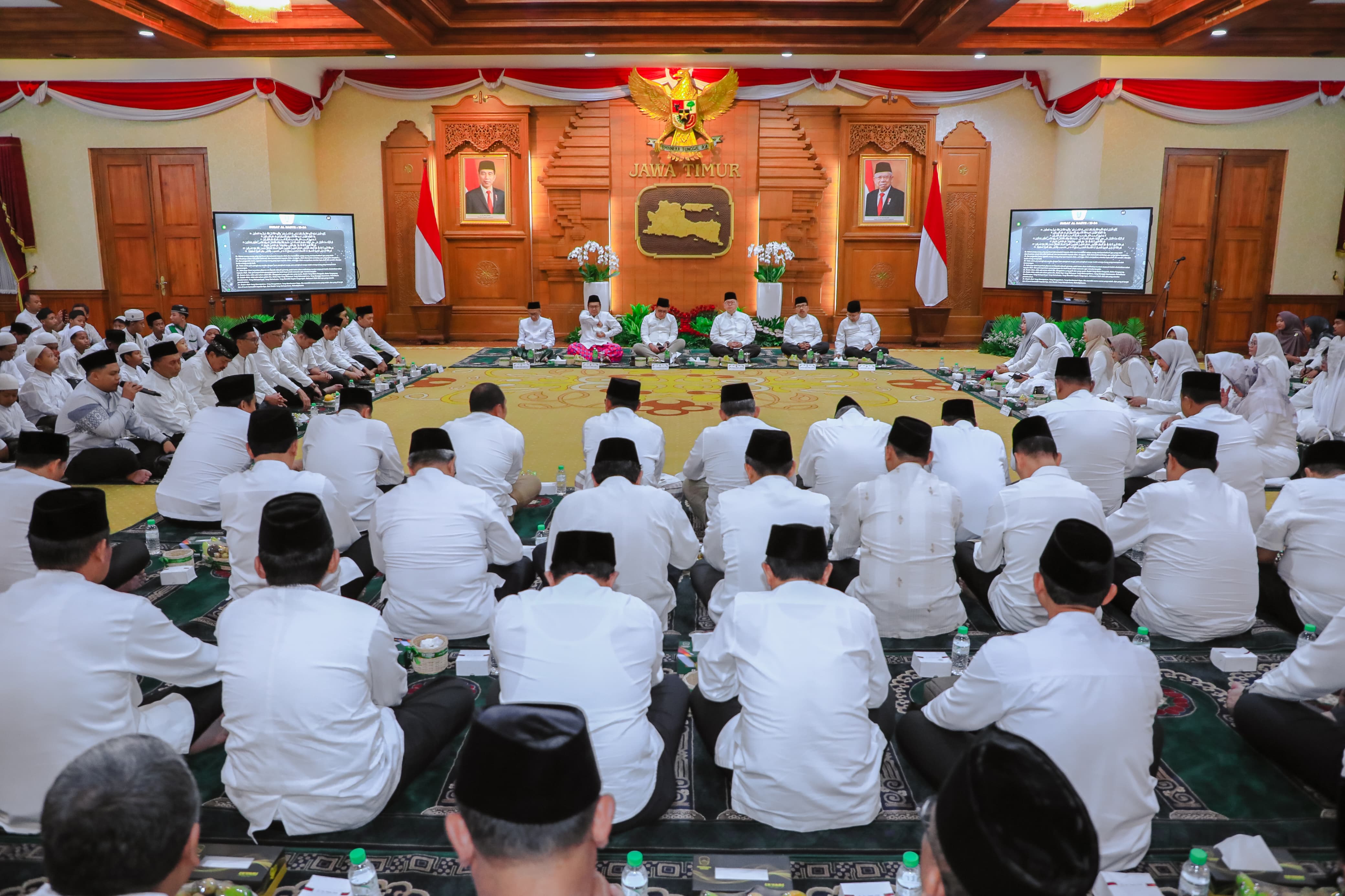 KANALSATU - Pj. Gubernur Jawa Timur Adhy Karyono menggelar Istighosah dan Doa Bersama para Kepala OPD Pemprov Jatim, Pimpinan Direksi BUMD, dan anak-anak yatim di Gedung Negara Grahadi, Senin (19/2/2024) malam. Istighosah ini dipimpin oleh Imam Besar Masjid Nasional Al Akbar Surabaya KH. Abdul Hamid Abdullah.