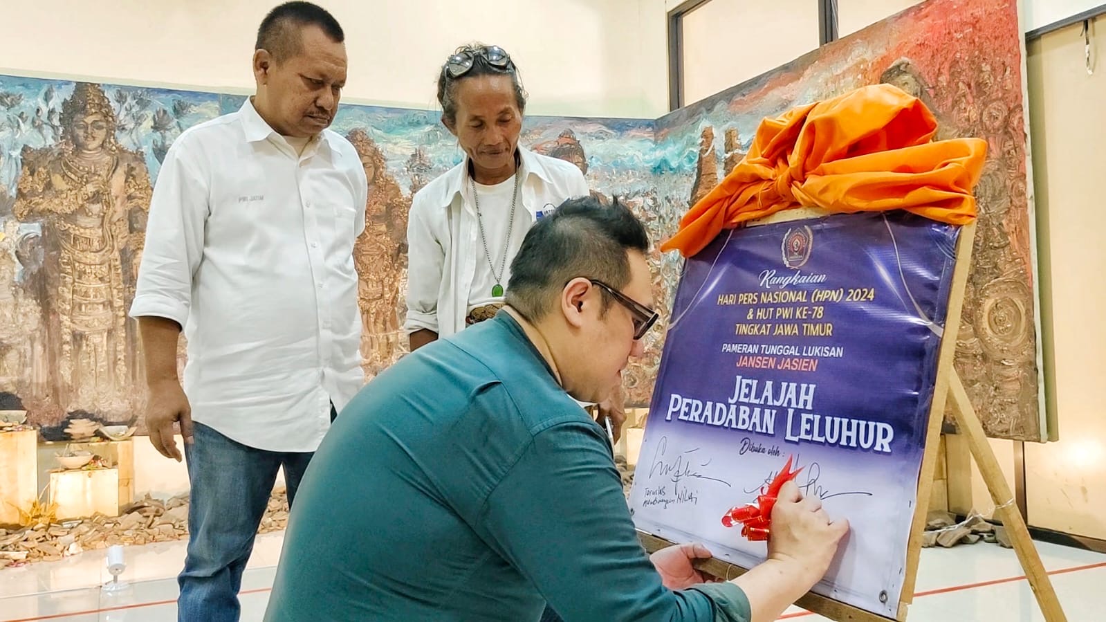 "Jansen Jasien (JJ), pelukis yang tampil tunggal pada pameran lukisan pasa HPN 2024 dan HUT PWI ke 78 tingkat Jawa Timur, mengambil tema; Jelajah Peradaban Leluhur," jelas Lutfil. (ard)