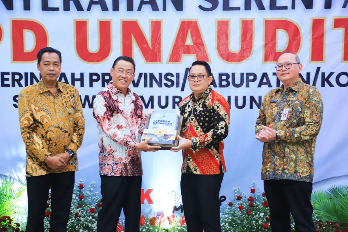 KANALSATU - Pj. Gubernur Jawa Timur Adhy Karyono bersama Walikota dan Bupati se-Jawa Timur menyerahkan Laporan Keuangan Pemerintah Daerah (LKPD) Unaudited Tahun Anggaran 2023 ke Badan Pemeriksa Keuangan (BPK) RI Perwakilan Jawa Timur, Selasa (5/3/2024).