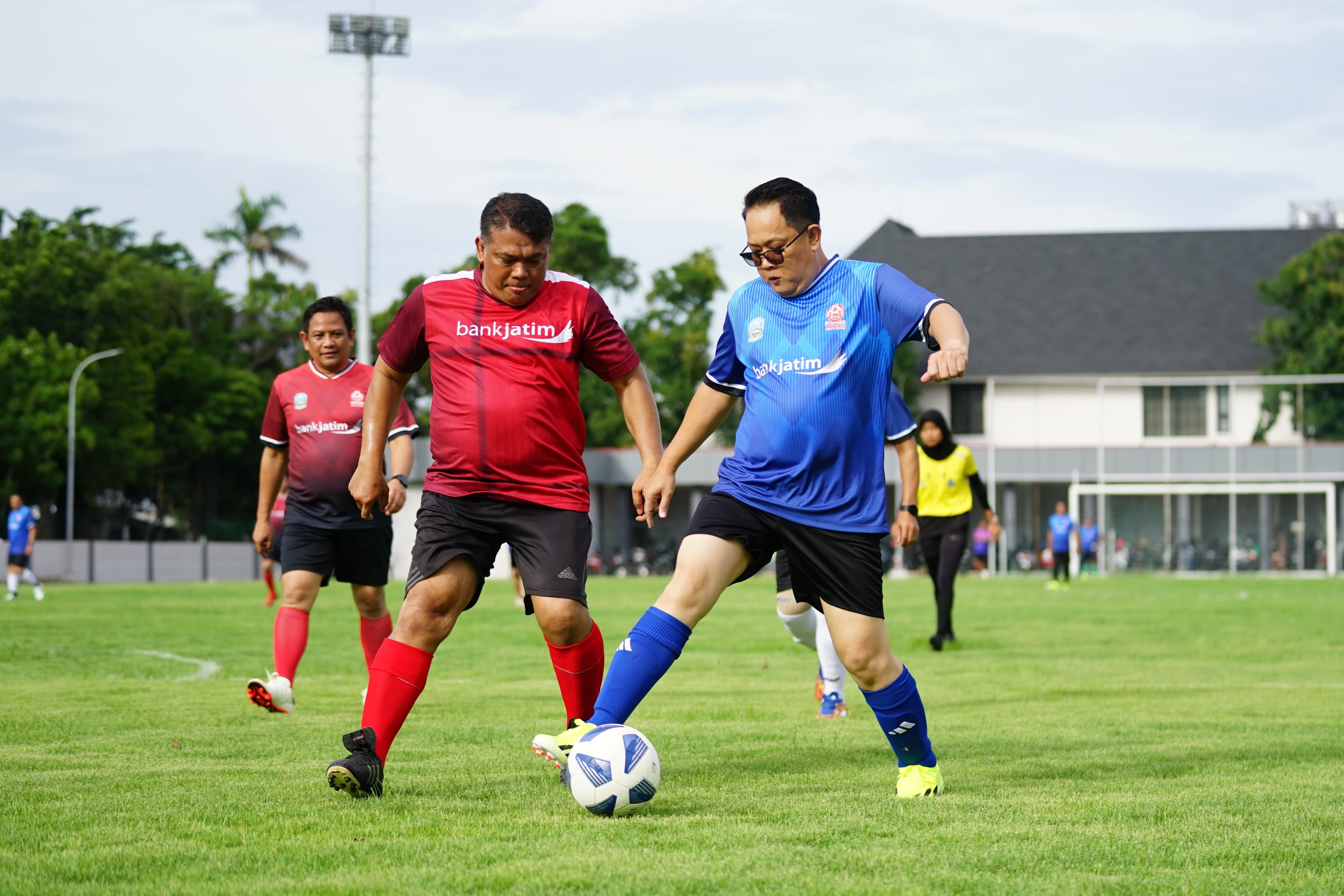 KANALSATU - Tim sepakbola Kepala daerah Pemprov Jatim berhasil mengungguli Pejabat Bank Pembangunan Daerah (BPD) Jawa Timur atau Bank Jatim dalam Pertandingan Persahabatan Sepak Bola "Mendadak Soccer" di Lapangan Marinir Bogowonto, Surabaya, Minggu (10/3/2024).